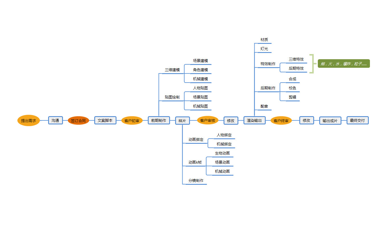 附一张三维动画的制作流程图:基本所有的项目都可以网上套。